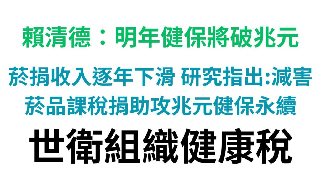 三、研議課徵健康稅,針對高風險消費如菸草、酒精、含糖飲料等設專款專用。