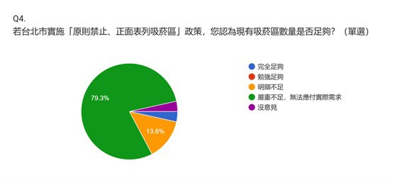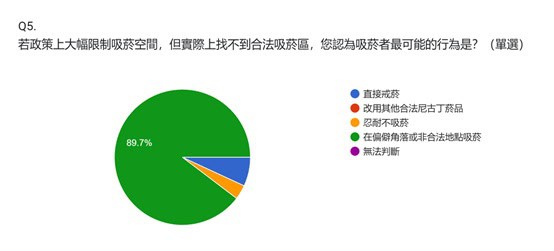 調查結果顯示,有八成五的民眾表示在台北市「不容易或非常困難」找到合法吸菸區或吸菸室,並有超過九成民眾認為,現有吸菸區數量「嚴重不足」或「明顯不足」,無法支撐高強度的全面禁菸政策。進一步詢問「若找不到合法吸菸區,吸菸者最可能的行為」,同樣有近九成受訪者選擇「在偏僻角落或非合法地點吸菸」,顯示政策若缺乏配套,恐使吸菸行為地下化,而非真正消失。