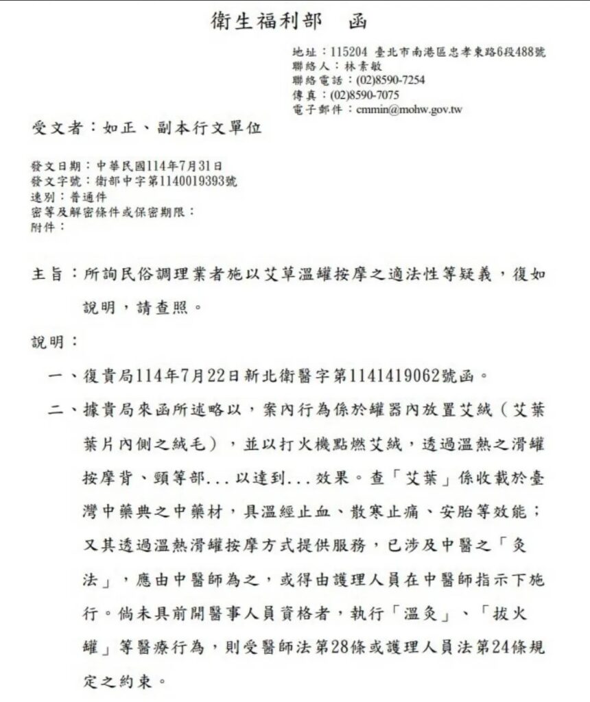 衛福部禁止艾草溫罐公文20250731。圖:擷取自網路