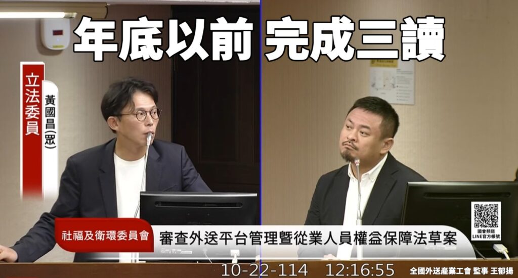 立法院社會福利及衛生環境委員會今(22)日終於排審外界期盼已久的《外送員權益專法》,台灣民眾黨立法院黨團總召黃國昌在會議上首先向衛環委員會召委廖偉翔表達感謝,強調馬路上「吹風淋雨的年輕人」心聲已等待太久,不能再拖延,黃國昌委員同時明確設定政治目標,宣示民眾黨團不會等待行政部門的緩慢腳步,將強力推動法案,目標在2025年底以前完成專法的三讀程序。